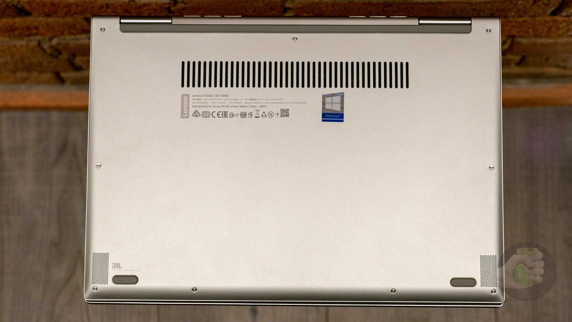 Сзади никаких элементов нет, только воздухоотводы, а решётки динамиков поставили на дно корпуса, рядом с резиновыми ножками. Очередное сомнительное решение, потому что динамики почти полностью закрываются поверхностью стола. В итоге из-за такой конструкции звук Yoga 530 немного приглушается, когда стоит в обычном положении.