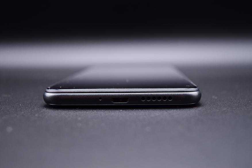На нижнем торце – микрофон, разъем для зарядки и динамик. И опять честно — динамик в смартфоне один, и отверстие под него тоже одно. Симметрично расположенного муляжа, как в китайских смартфонах, вы не найдете.