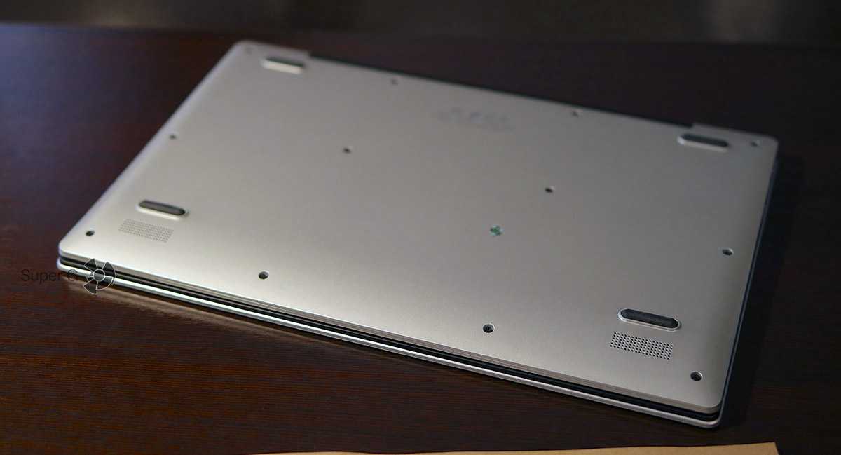 Внизу — крышка, закрепленная на 2 винтов, с отверстиями для стереодинамиков, и резиновые ножки. Отверстий для системы охлаждения здесь нет: оно пассивное, так что работает ноутбук бесшумно. Совсем.