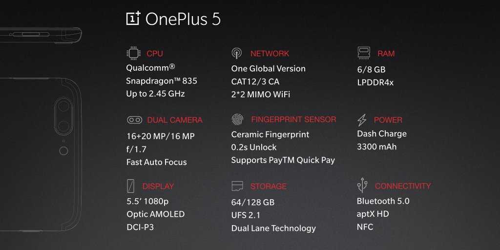 Экран: 5.5-дюймовый Optic AMOLED-дисплей с FullHD (1920 x 1080) разрешением (401 dpi)Материалы корпуса: метал c пластиковыми полосками под антенныЦвета: серый, золотой, черныйПроцессор: Процессор Qualcomm Snapdragon 835, 8-ядерный (4 ядра Kryo 280 с частотой до 2,46 ГГц + 4 ядра Kryo 280 с частотой до 1,9 ГГц).Графика: Adreno 540 (710 МГц)Операционная система: Android 7.1.1 + Oxygen OSОперативная память: 6/8 ГБ LPDDR4Пользовательская память: 64/128 ГБ без возможности расширенияКамера: сдвоенный фотомодуль с разрешением 16 МП (Sony IMX 398; f/1.7) и 20 МП (Sony IMX 350; f/2.6), фронтальная камера: 16 МП (Sony IMX 371; f/2.0)Поддержка сетей: 2G: GSM 850/900/1800/1900MHz 3G: WCDMA 850/900/1900/2100MHz 4G: FDD-LTE 1700/1800/2100/2600MHz два слота под карты nanoSIM, радиомодуль одинБеспроводные технологии: Wi-Fi 802.11 a/b/g/n/ac (2.4 и 5 ГГц), Bluetooth 5, GPS/GLONASS, поддержка A-GPS, NFC.Датчики: сканер отпечатков пальцев, акселерометр, датчик Холла, гироскоп, цифровой компас, расстояния и освещенностиДополнительно: USB Type C, 3.5 мм разъем для гарнитуры, индикаторный светодиодАккумулятор: 3300 мА*ч, несъемный, поддержка быстрой зарядки Dash ChargeКомплект поставки: блок питания (5В — 4А), USB-кабель, скрепка для извлечения лотка, инструкция.Размеры: 154.2 x 74.1 x 7.25 ммВес: 153 граммаЦена: от 450 долларов