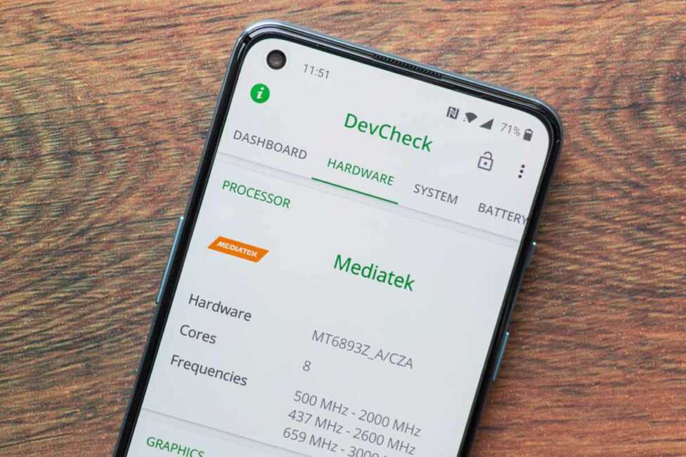Интересная особенность OnePlus Nord 2 5G заключается в используемом в нём чипсете. Компания решила отказаться в этом смартфоне от платформы производства Qualcomm и снабдила новинку достаточно свежим и редким чипом — MediaTek Dimensity 1200 5G (MT6893). На данный момент Dimensity 1200 5G считается флагманским чипсетом MediaTek. Он изготовлен по 6-нм техпроцессу и располагает восемью ядрами, которые поделены на три кластера: 1 ядро Cortex-A78 работает с максимальной тактовой частотой до 3,0 ГГц, ещё 3 ядра Cortex-A78 с тактовой частотой до 2,6 ГГц, а остальные 4 ядра Cortex-A55 — тактовой с частотой до 2,0 ГГц. В роли графического ускорителя применяется Mali-G77 MC9 с 9 ядрами.