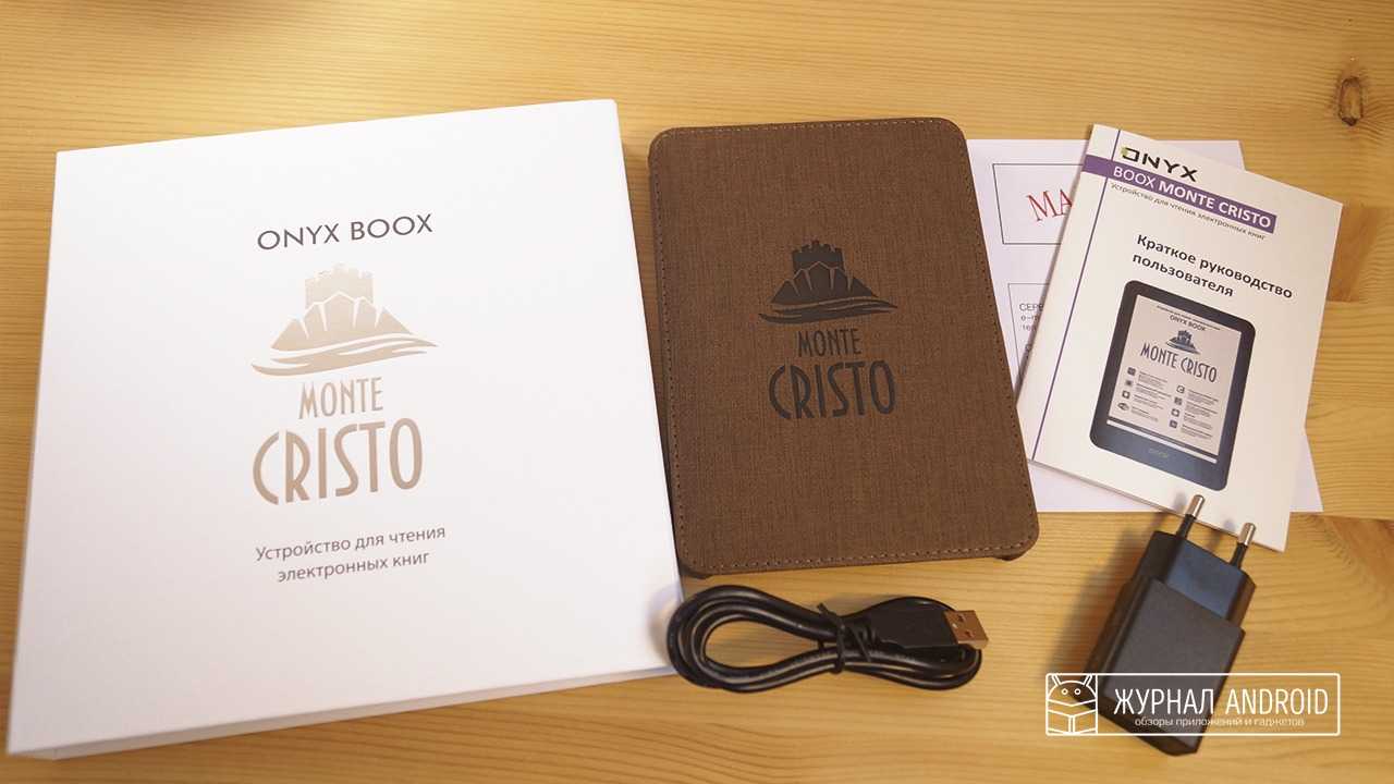 В комплектепомимо самой книги ONYX BOOX Monte Cristo 3вы найдёте отличный добротный чехол, выполненный в стиле самой книги, зарядное устройство с отсоединяющимся кабелем и несколько бумажек, а точнее гарантийный талон и краткое руководство пользователя.