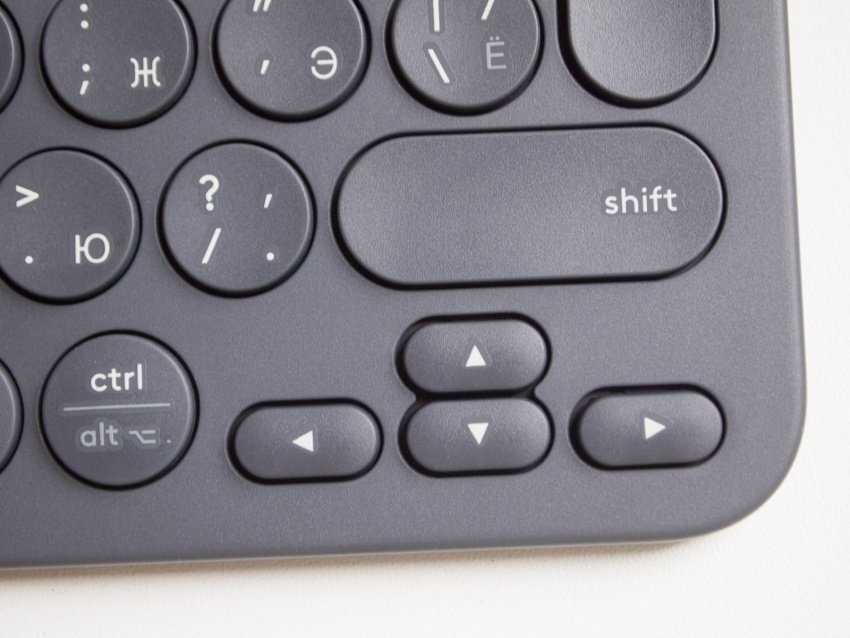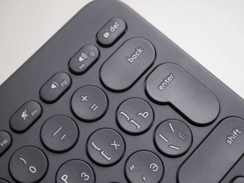 Клавиши на K380 достаточно маленькие, что обусловлено форм-фактором устройства: мужчине с крупной рукой первое время будет неудобно. Но через несколько дней количество случайных нажатий на соседние клавиши сводится к минимуму. Ход у клавиш самый обычный, сравнимый с низкопрофильной клавиатурой любого ноутбука.