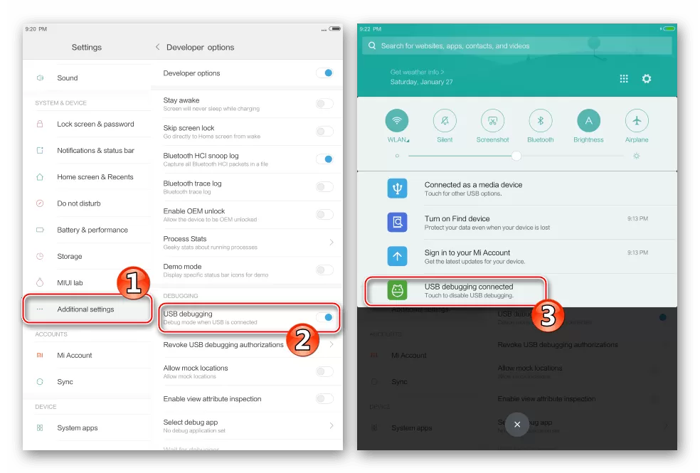 В дополнительных «settings»→ «SYSTEM & DEVICE» → «Developer» → включить «USB debbuging»;