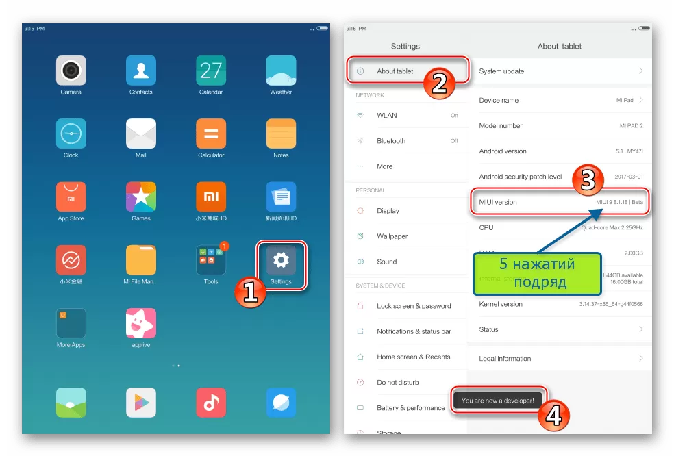 - Включить «Отладку по usb». Для этого: «About tablet» (в «Settings») — кликнуть по «MIUI version» (пять раз), пока не откроется опция «Developer»;