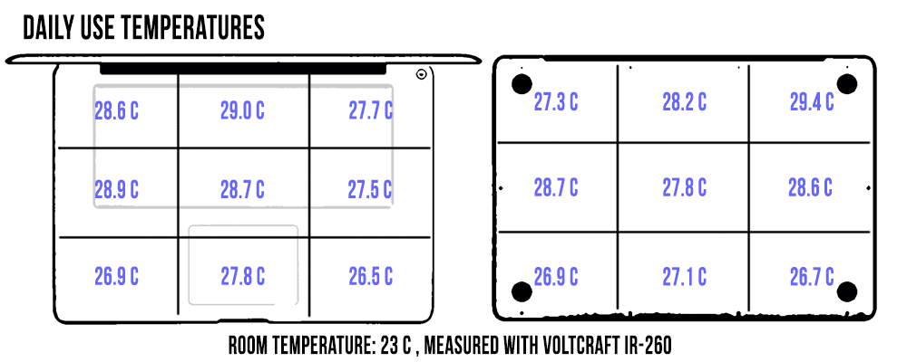 While performing the stress test, the CPU’s frequency stabilizes at 1100-1200 Mhz (jumps between these two values) and the graphics run at 800 Mhz. There’s no sign of throttling under normal use.