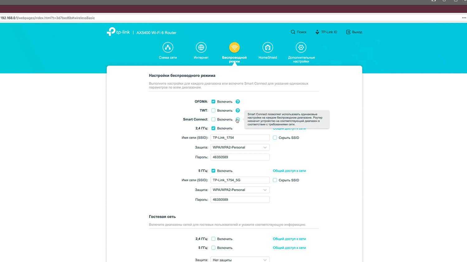 Есть функция Smart Connect. Если режим включен, пользователь не задумывается, какую сеть использовать — 2,4- или 5-гигагерцевую. К какой подключить девайс определяет маршрутизатор. 5-гигагерцевый явно в приоритете. Удобно. Исключение — опытный пользователь точно уверен, какому девайсу к какой сети нужно подключаться.