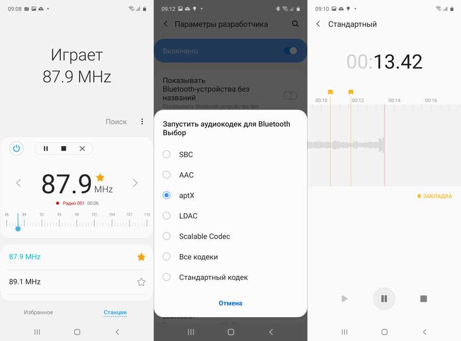 Входящая в комплект проводная гарнитура понадобится в качестве коротковолновой антенны для работы FM-тюнера, который умеет записывать онлайн-трансляции в M4A-файлы. Контент из приложения «Звукозапись» сохраняется в таком же формате. При этом, качество записи предварительно настраивается: высокое (256 кбит/с, 48 кГц), среднее (128 кбит/с, 44,1 кГц) или низкое (64 кбит/с, 44,1 кГц). Для поддержки беспроводных аксессуаров позаботились о наличии Bluetooth-кодеков aptX и LDAC, поддерживающих беспроводную передачу качественного звука.