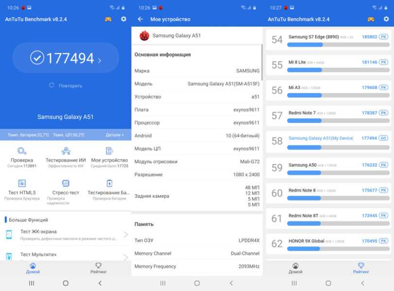 В синтетическом тесте AnTuTu Galaxy A51 набрал 180 тысяч очков. По состоянию на конец 2019 — первую половину 2020 года это средний, но вполне достаточный результат. Грубо говоря, запаса по производительности достаточно, чтобы не испытывать проблем как с работой операционной системы (например, при активации темного режима), так и при запуске навороченных игр вроде Call of Duty Mobile.