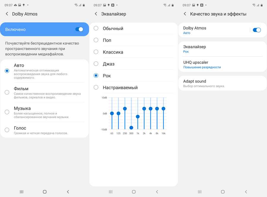 После подключения проводных наушников в расширенных настройках звука можно активировать опцию объемного звучания Dоlby Atmоs и функцию улучшения качества звука UHQ upscaler. При этом, пространственное звучание реализуется через четыре профиля — «Авто», «Фильм», «Музыка» и «Голос». Также предлагается воспользоваться 9-полосным эквалайзером с шестью пресетами, включая настраиваемый.