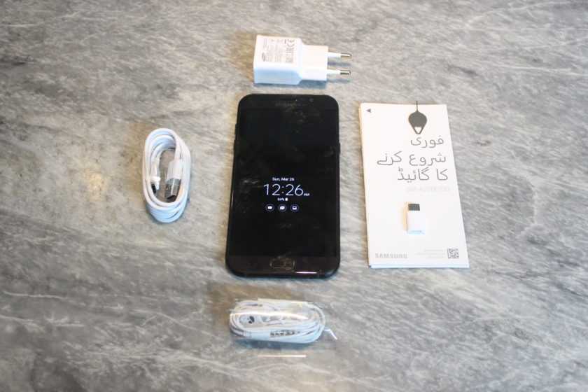 Samsung Galaxy A7 (SM-A720F) модельного ряда 2017 года поставляется в коробке из плотного картона белого цвета. На лицевую часть нанесено название модели, на оборотной – основные технические параметры. Изображения гаджета отсутствует.
