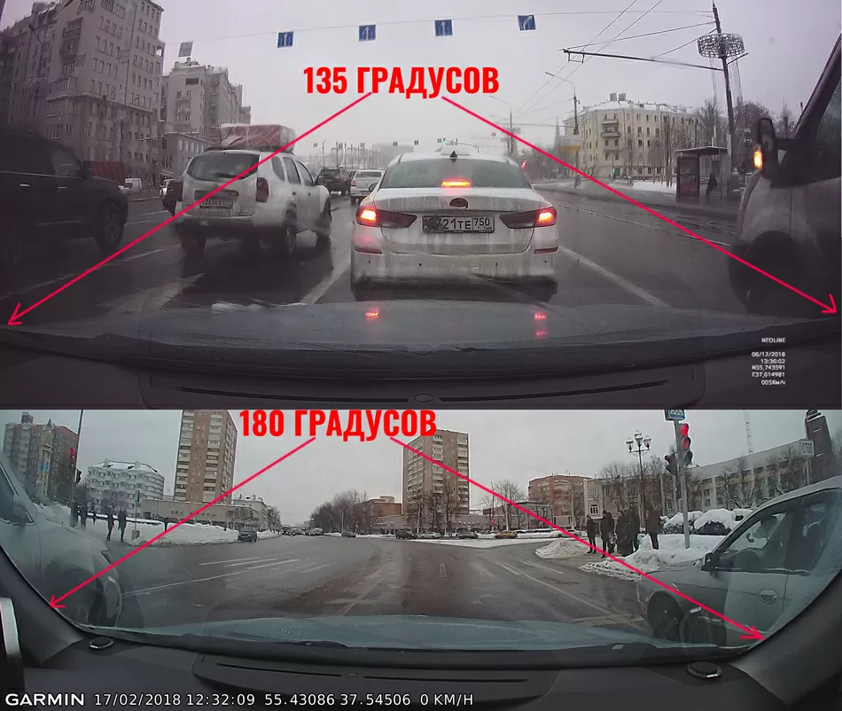 Угол обзора камеры по современным меркам, не такой уж и большой — 135 градусов, но со стеклянной оптикой, устойчивой к ультрафиолетовому излучению. Кто бы что ни говорил, вот вам сравнение 180-градусной области видимости и 135-градусной. Я считаю, что широкоугольная съёмка важна в автобусах и грузовиках, но никак не на седанах.
