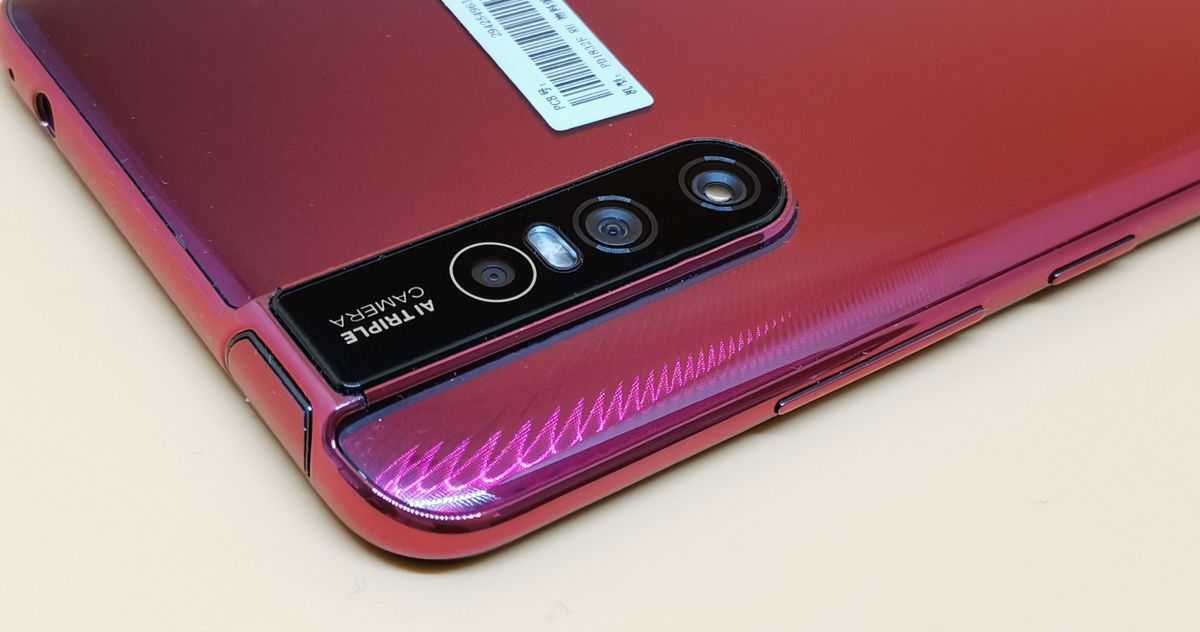 На задней стороне располагается тройная камера и механизм выдвижения селфи-камеры. Размеры этих модулей приводят к тому, что они выступают за пределы корпуса. Это придаёт устройству отличительный внешний вид, но он может понравиться не всем.