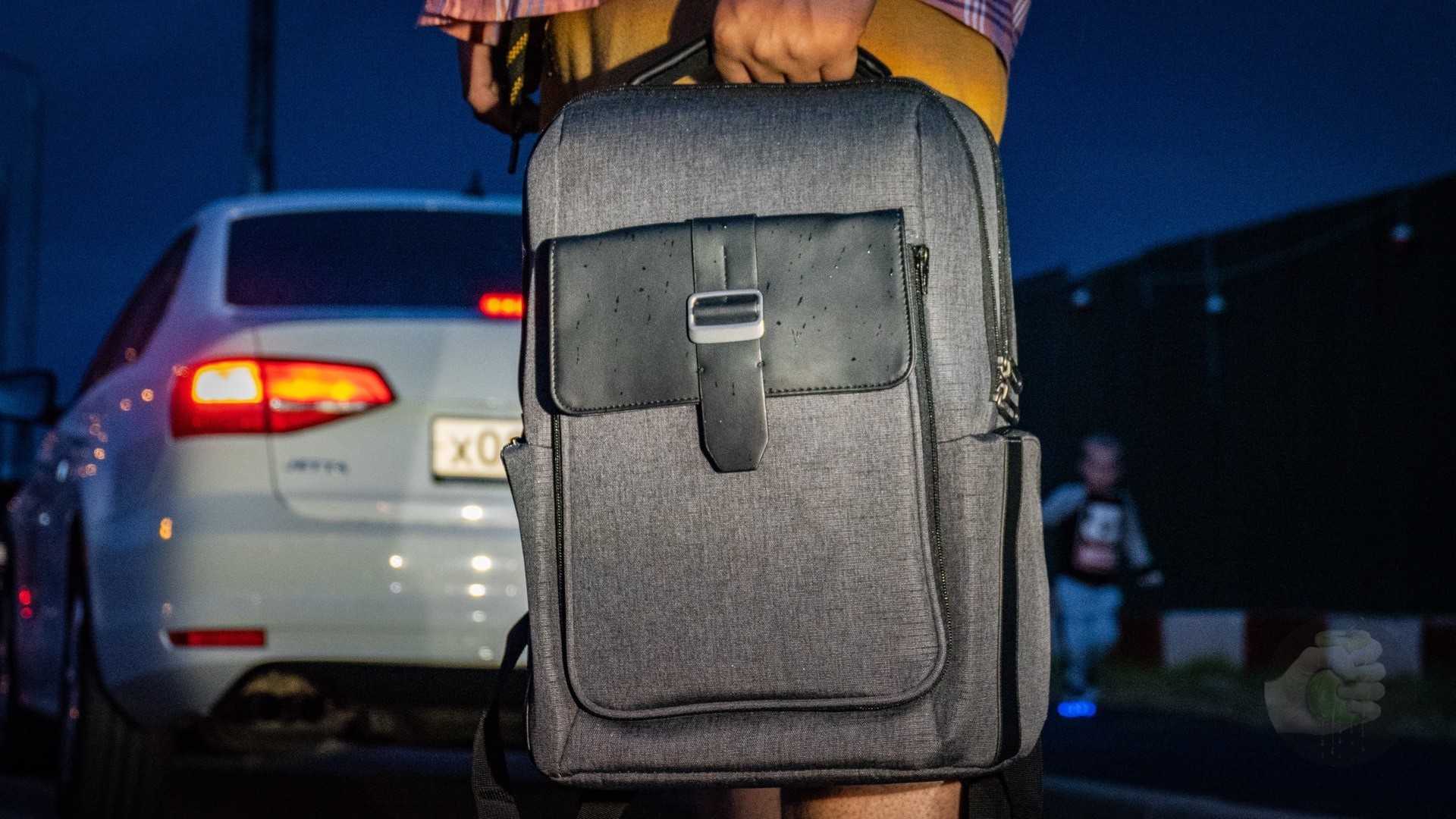 Зато Xiaomi Business Travel стойко переносит все невзгоды, грязь и слякоть. Опять же, карманы удобно открываются, молнии легко ездят и эффективно защищают содержимое от внешнего воздействия. Отдельно отмечу клапан и дно: это основные места контакта с руками и грязным полом. Использованный кожзам устойчив, поэтому никаких проблем даже при самом агрессивном использовании я не заметил.Конструкция рюкзака работает не хуже: можно бросить кружку на дно основного отделения, и она переживет активный день. Основную роль играет плотная ткань и внутренняя прокладка.