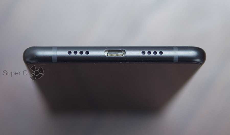Снизу — разъём USB Type C, микрофон, рядом основной динамик. Он громкий, и их даже два. Второй динамик — вместо разговорного, но звучит он настолько тихо, что первое время кажется, что используется только один динамик. Качество звучания хорошее, он играет лучше Galaxy S 8, но будет уступать звучанию HTC U 11.