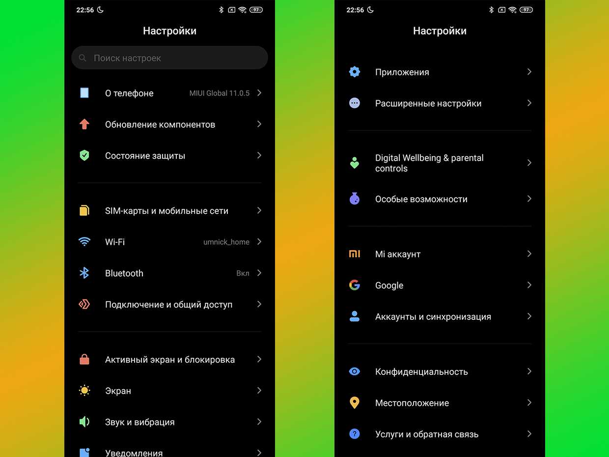 Худшим изменением MIUI 11 я склонен считать обновлённое меню настроек. Разработчики подогнали его внешний вид под стандартный, будто в стоковом лаунчере Android AOSP. Впихнув в стандартное же число пунктов на первом экране все изобилие настроек системы Xiaomi.