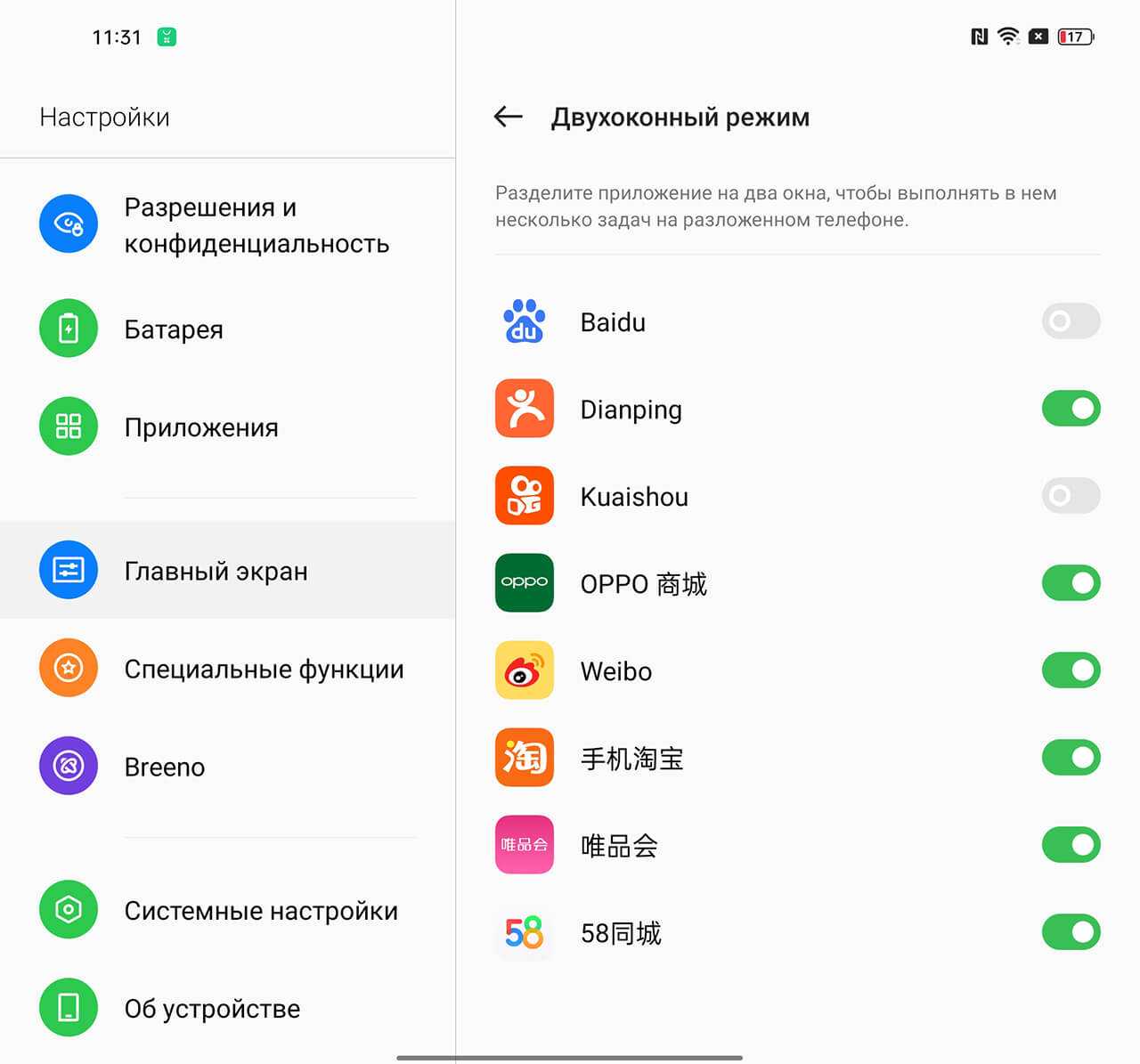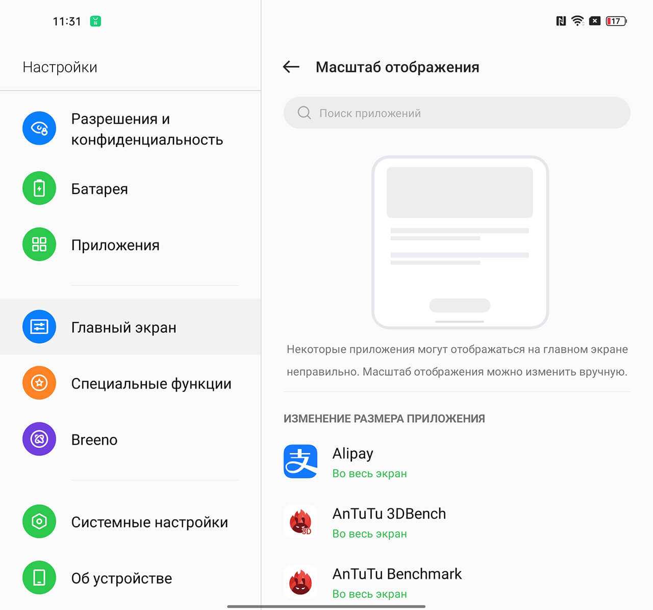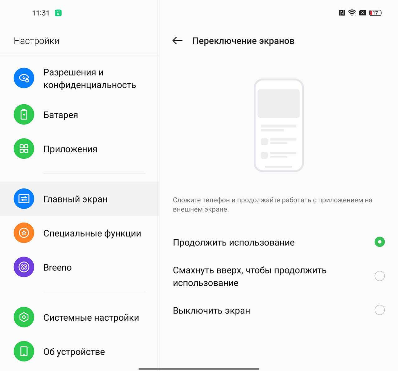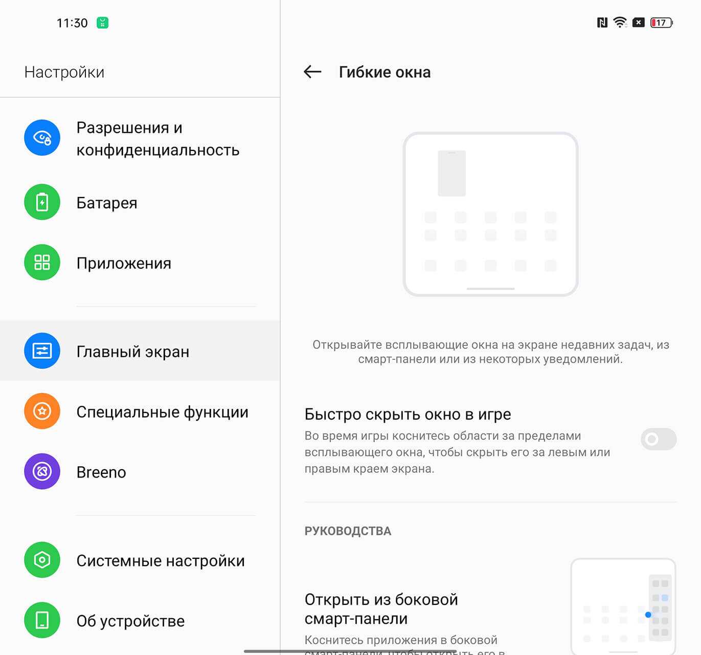 Самое важное – это изменения, которые коснулись сугубо Find N. Начать описание следует со вкладки Главный экран, где содержатся главные параметры для сгибающегося экрана