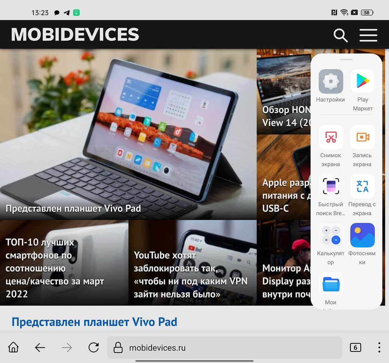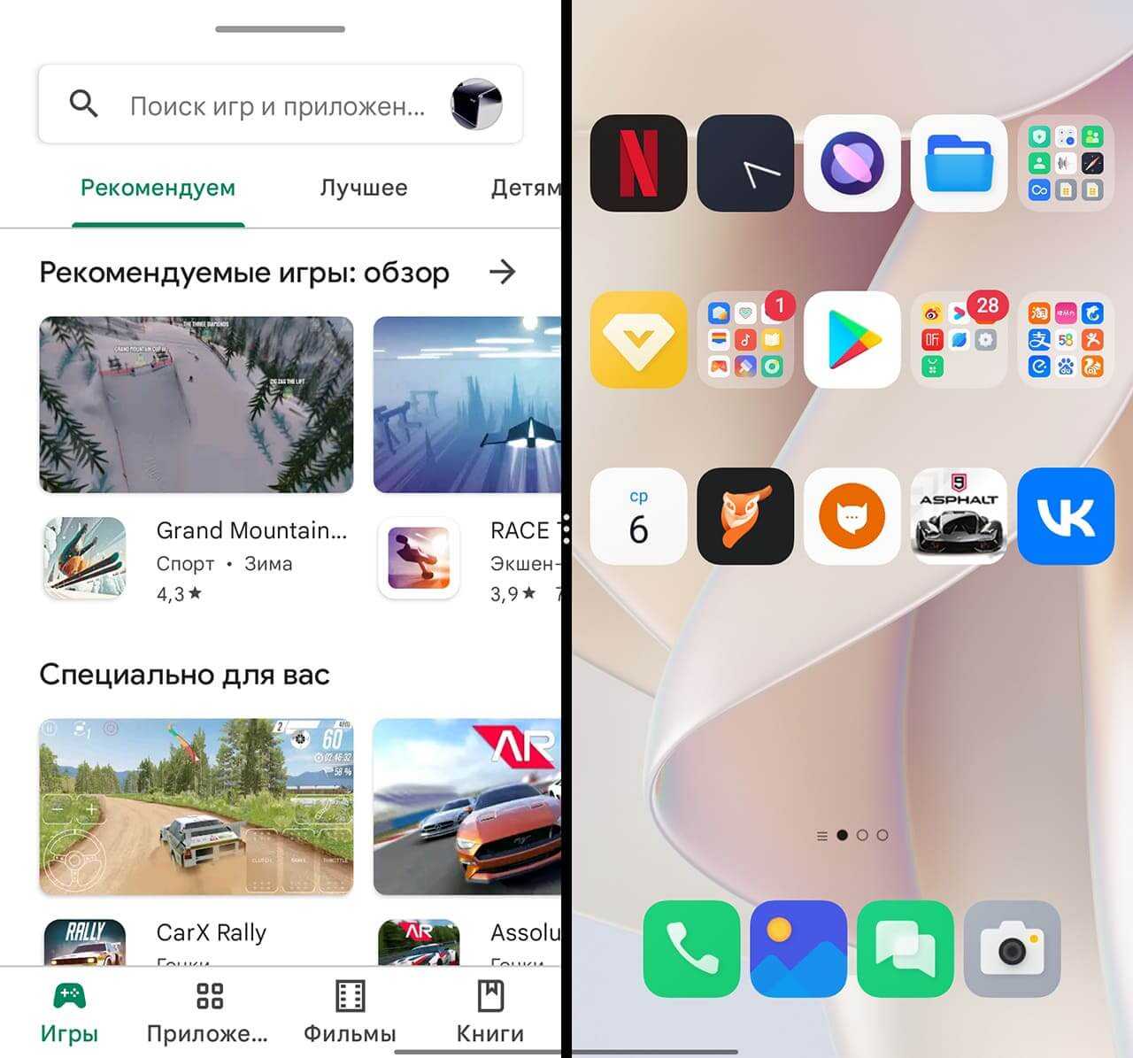 Итак, по порядку. Разделение экрана, которое выполняется жестом двух пальцем вниз. Таким образом становится доступно разделение на два приложения, где имеющийся по центру ползунок возможно передвигать влево или вправо, увеличивая площадь одной сторон.