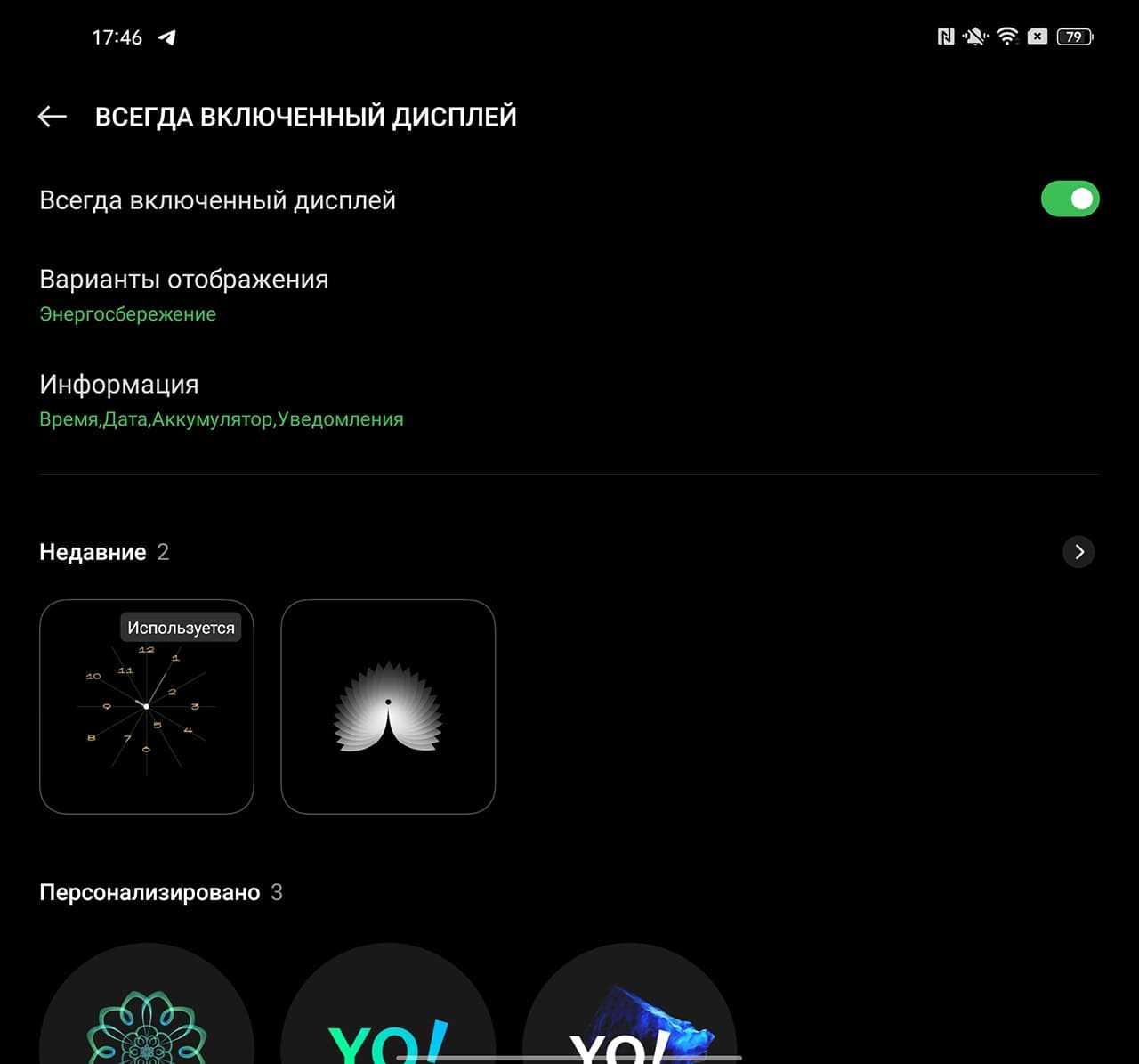 На всех трёх дисплея поддерживается технология Always On Display. В настройках она находится в пункте Персонализация –> Всегда включенный дисплей. Имеются три варианта отображения информации на экране в соответствии с зарядом батареи и планирования. Вкладки уже имеющихся аналоговых и цифровых циферблатов отображены в Недавних Представлено системой, и Стили включенного дисплея из сети.