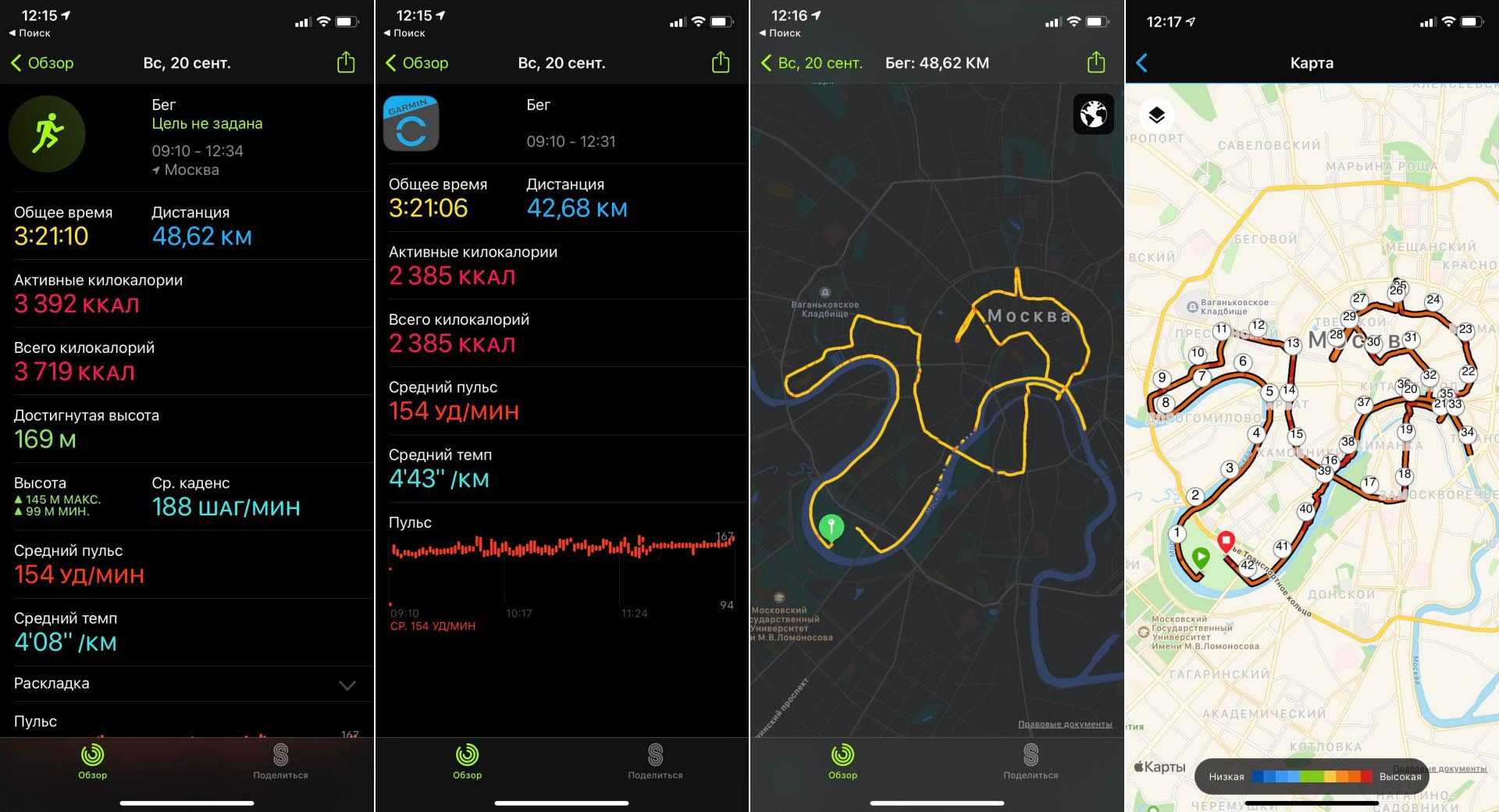 Однако московский марафон, который прошёл в минувшие выходные, он пробежал с двумя часами — своими Garmin Forerunner 245 и Apple Watch Series 6. В стандартных тренировках часы Apple накрутили ему почти шесть тысяч метров сверху на 42 195. При этом карта, как вы можете увидеть, одинаковая: