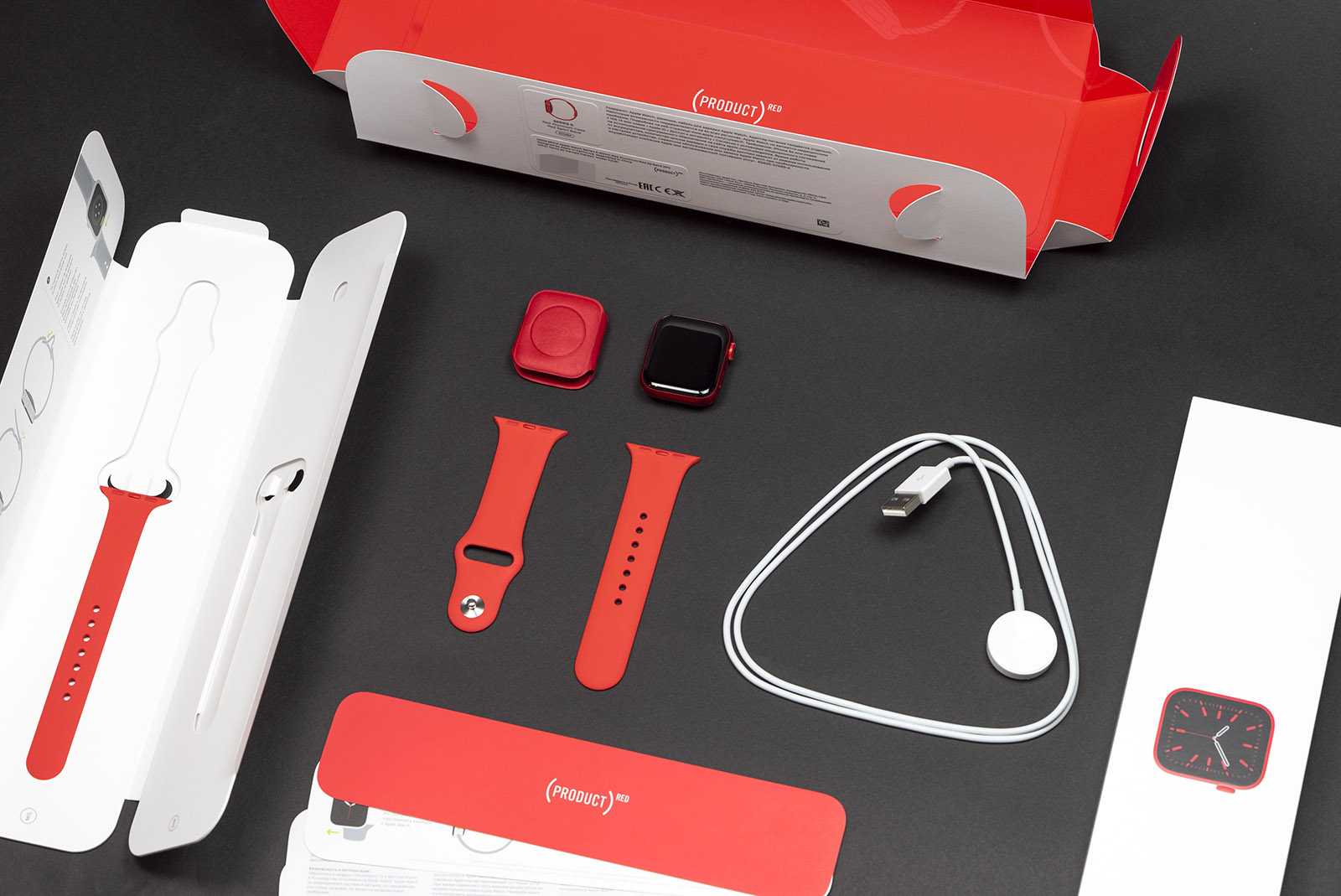 Упаковка по-прежнему раскрывается, как цветок, обнажая две коробки: отдельно браслет и часы. Внутренняя сторона «обёртки», как и в прошлом году, соответствует цвету корпуса. Принт смотрится здорово в красном исполнении.