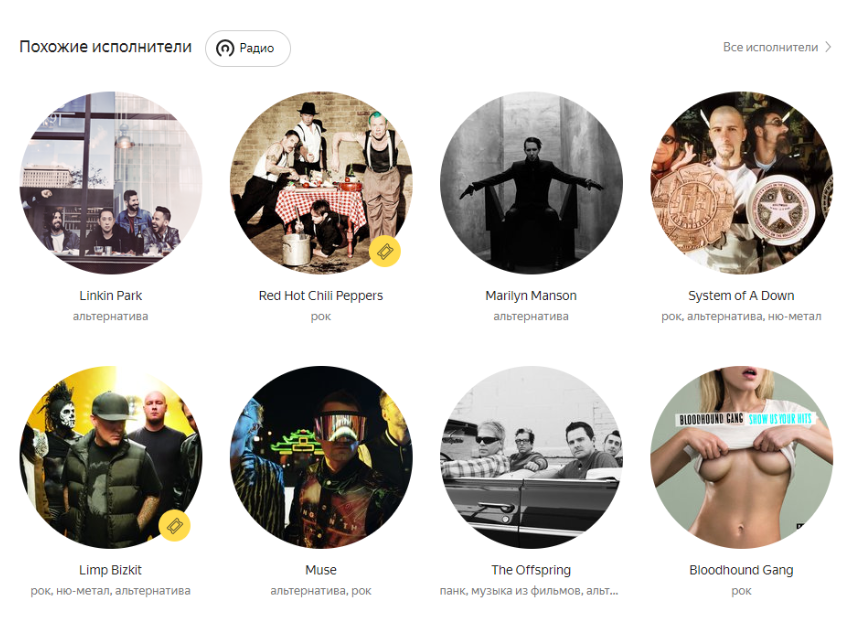 Самая важная и самая провальная часть Яндекс.Музыки. Убедиться в этом просто, достаточно зайти на страницу любой очень популярной группы, например, Nirvana.