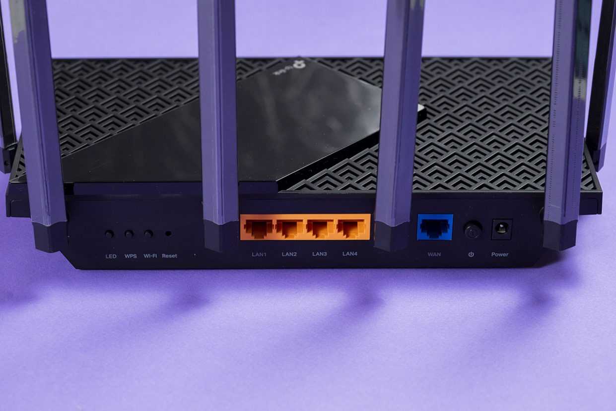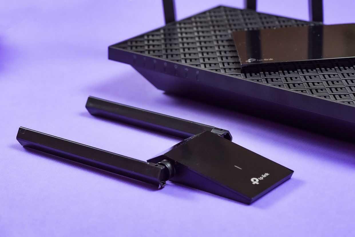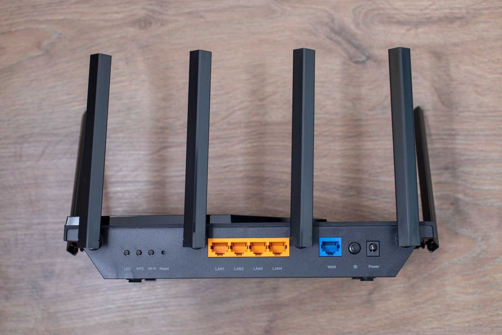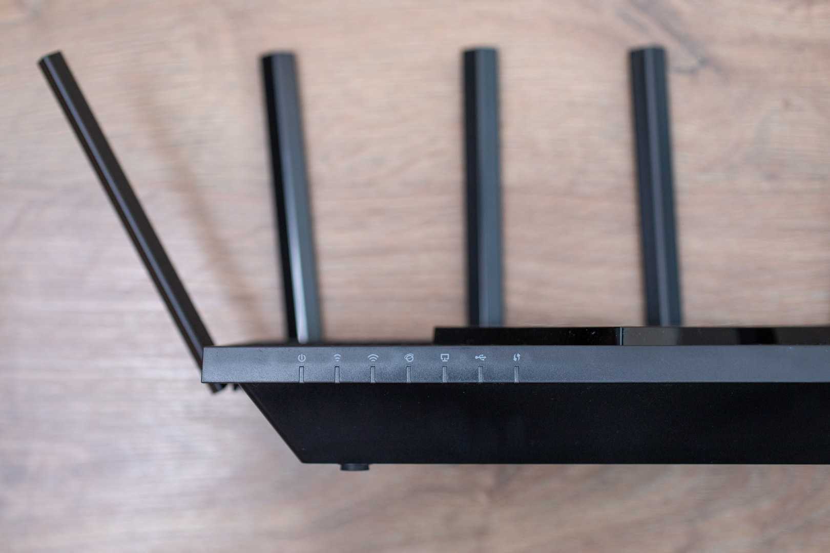 У TP-Link Archer AX73 AX5400 есть шесть внешних антенн. Первая и третья нужны для работы в сетях 2,4 ГГц, а остальные — в 5 ГГц.