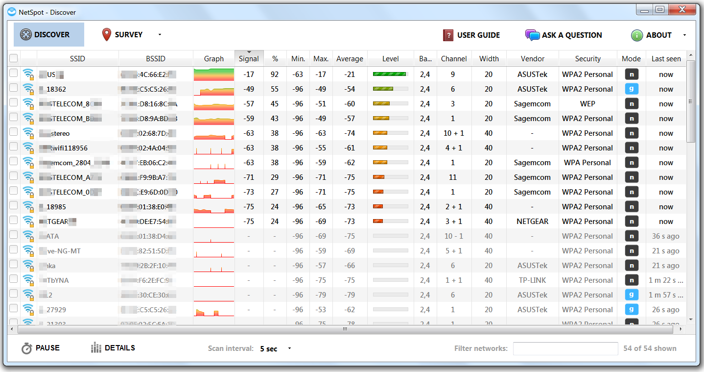 За пару минут сканирования я нашел 54 хотспота в диапазоне 2,4 ГГц, но стабильная связь возможна только с тремя из них. Более-менее ловятся еще восемь AP, а соединение с остальными возможно только при использовании направленной антенны или мощного усилителя. Моя основная точка доступа в таблице отсутствует. Дело в том, что NetSpot не показывает сети со скрытым SSID. Добавить их вручную тоже нельзя.