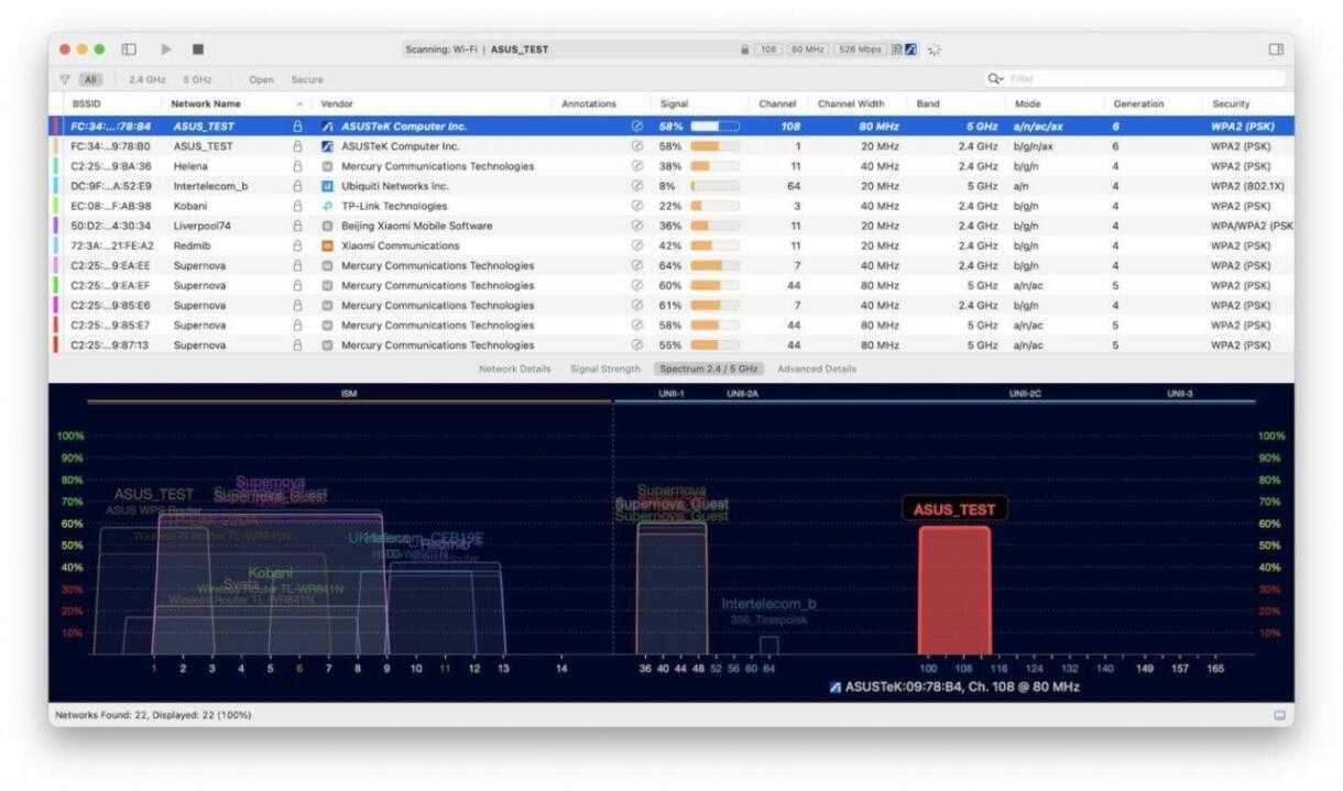 Если надо улучшить связь в одном конкретном месте, то делать карту всего помещения необязательно. Для этого у NetSpot есть мониторинг в режиме реального времени. Уже через несколько секунд после запуска можно получить представление об общей картине в эфире, а затем изучать ее более прицельно.