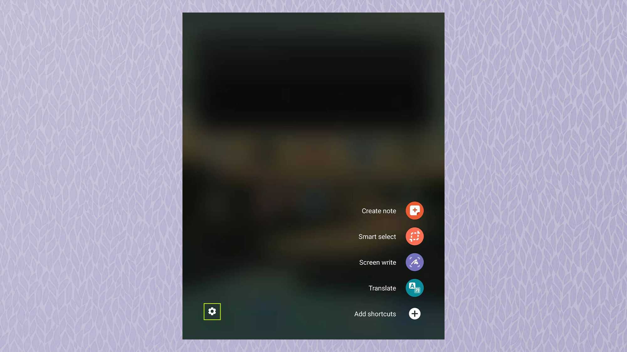 1. Первое, что нужно сделать при изучении использования стилуса Samsung S Pen, — это парить в S Pen над главный дисплей и Нажмите в кнопка сбоку пера. Это вызовет быстрое меню со списком популярных опций, которые вы можете настроить в зависимости от вашего использования. Для этого коснитесь значка шестеренки в левом нижнем углу.