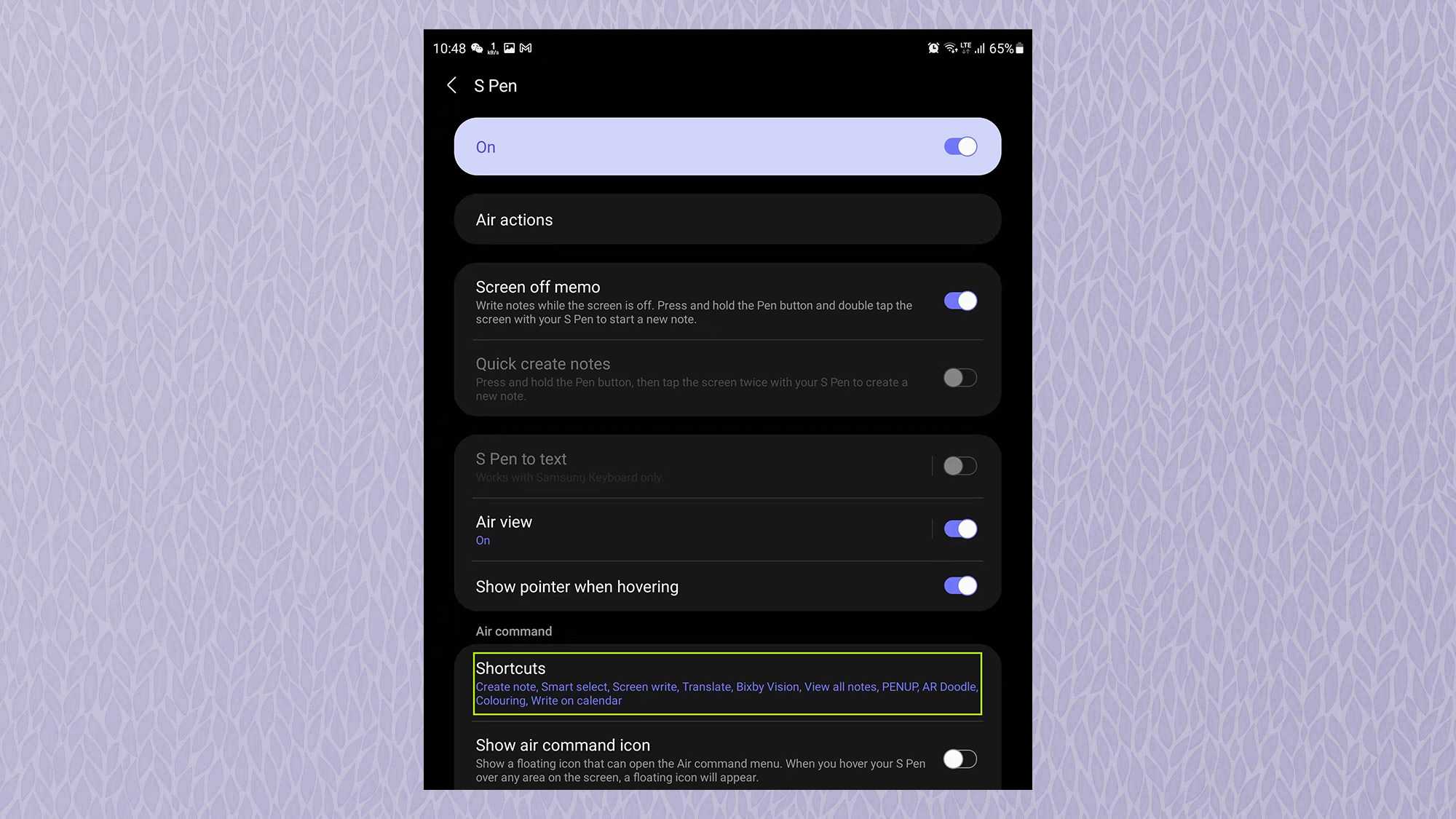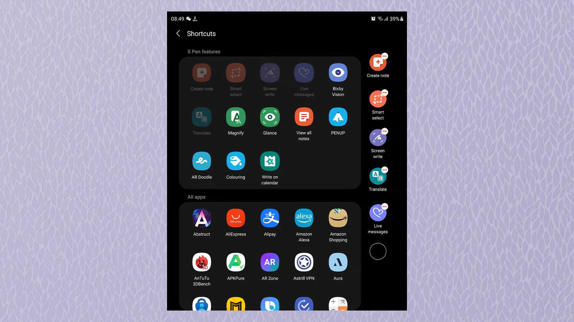 3. Теперь вы увидите список всех доступных Возможности S Pen. К правильно дисплея — это функции, которые уже прикреплены к быстрому меню. Эти функции выделены серым цветом в главном меню слева.