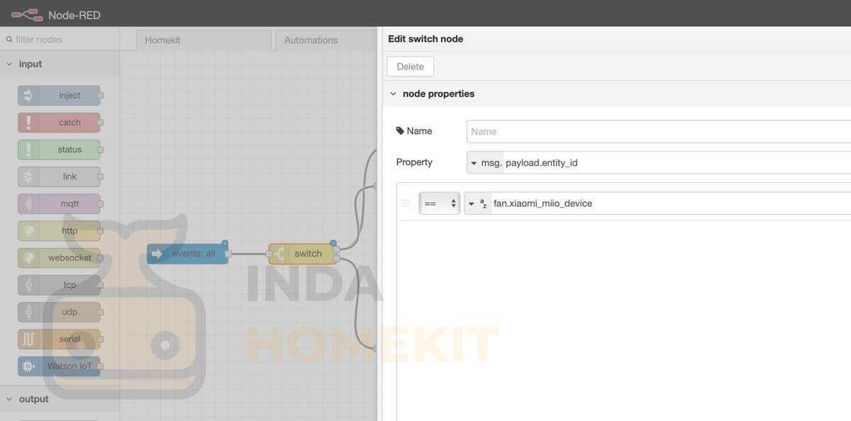 После добавления блока events:all нам необходимо отделить наш увлажнитель от всех остальных устройств, для этого мы добавляем блок switch, в котором прописываем условие с названием entity_id нашего увлажнителя (в моем случае это был fan.xiaomi_miio_device)