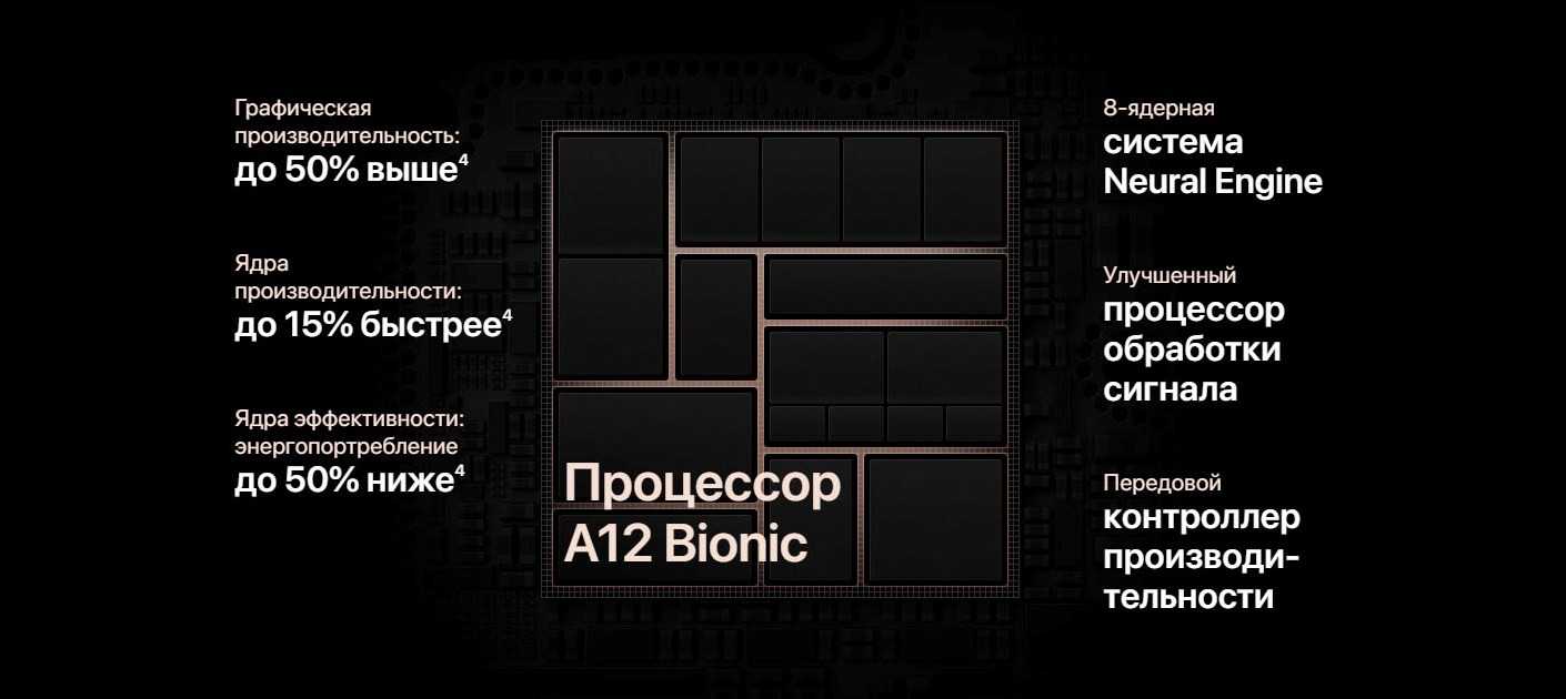Внутри смартфона находится процессор A12 Bionic с мощными и энергосберегающими ядрами, сделанными на основе 7нм процесса. Какое значение имеет маленький размер процессора? Маленький размер означает меньший расход ресурсов, а тот в свою очередь меньший расход батареи. 7нм процесс очень впечатляющая технология. Процессоры Apple бесспорно остаются лучшими в мире.